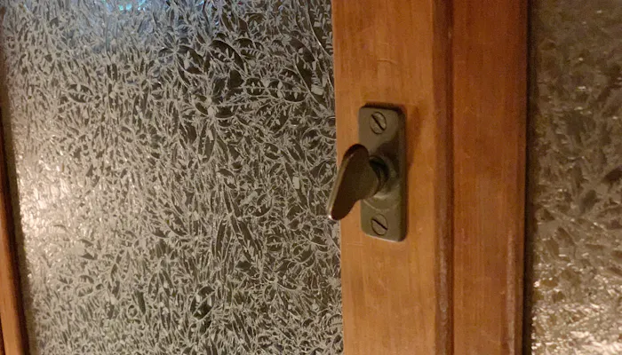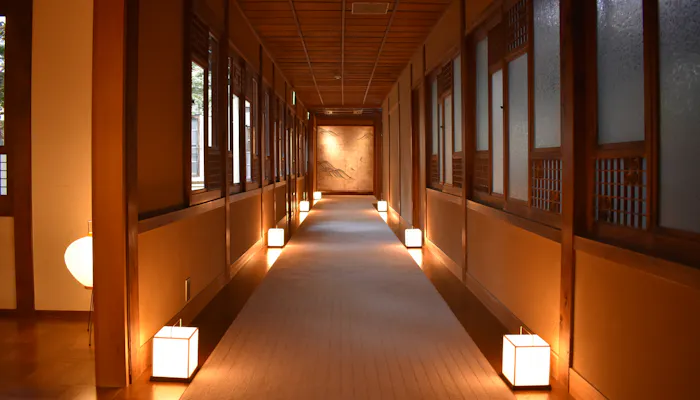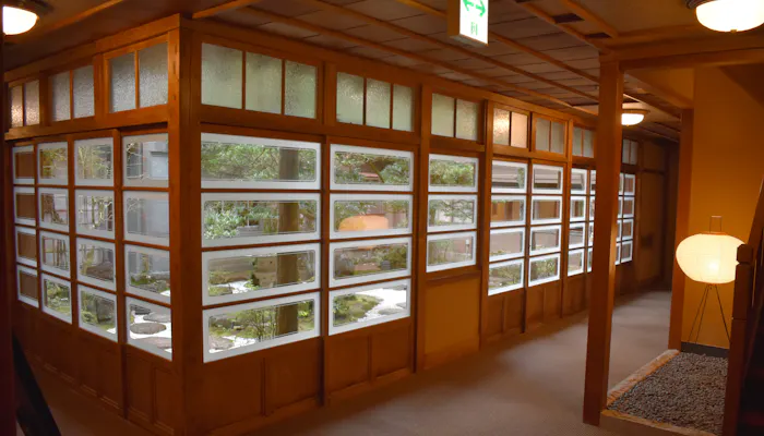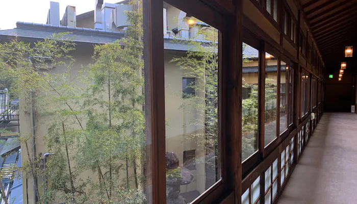 廊下の左右には、組子細工を施した窓枠。ロビーに向かって右側には、一面に霜が振ったように美しい模様の「結霜(けっそう)ガラス」が。外の明るい日差しは窓を通して柔らかく、廊下を照らし、夜は照明の明かりが淡く反射し、幻想的な空間に。