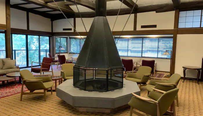 古き良き時代の面影はそのままに、ラウンジには、これまでよりも大きい暖炉を中央に設置。北欧のデザインチェアに深く座り、お部屋に行く前にここでコーヒーなどをいただくのも楽しみ方の一つ。