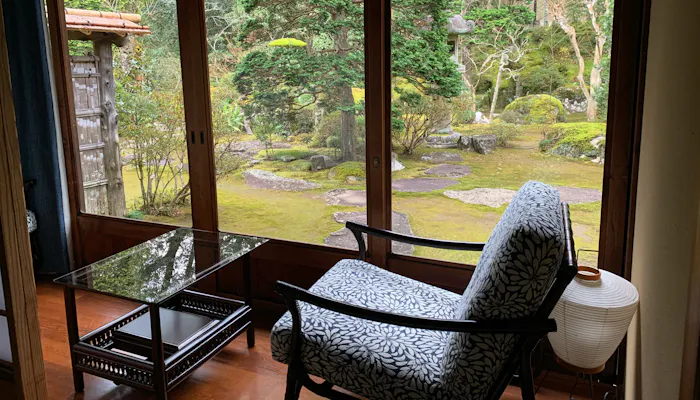 「おちあいろう」には本館と眠雲亭があり、こちらは眠雲亭の1階。美しいお庭が眺められ、自らミルで挽く、宿こだわりのコーヒーを飲みながらボーっとするのもいいかも。