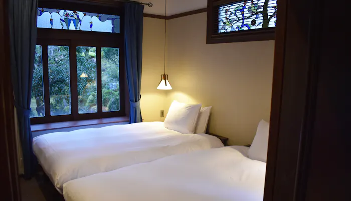 三方にあるステンドグラスが目を引くベッドルーム。「おちあいろう」では、このベッドに大きなこだわりが。お宿特注のベッド、布団、枕で、私はあまりの寝心地の良さに、朝起きたとき自分の家と一瞬勘違いするほど、リラックスして深い眠りにつくことができました。実はこちら、販売もしているそうです。