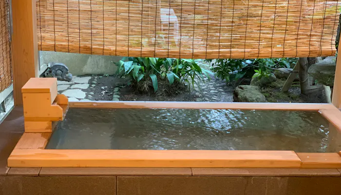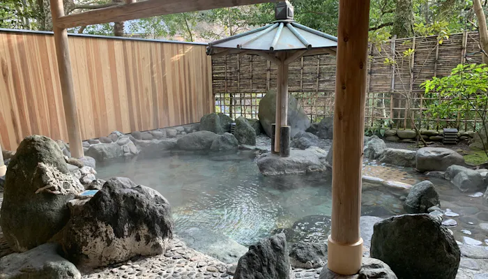 檜が香る、足をのばせる大きめの露天風呂。自分のタイミングで天城湯ケ島温泉をかけ流しで堪能できるのは贅沢です。