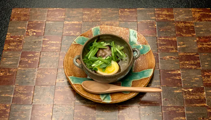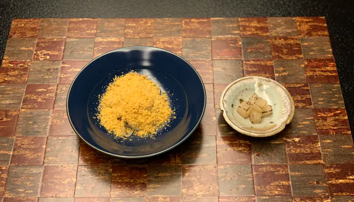 「唐墨うどん大根」。からすみの山の中に、黒米を混ぜもちっとした食感に仕上げた細いうどんが隠れています。からすみがこれでもかというほどかけられていて、余ったからすみに焼き大根をあえて、からすみ大根にしても美味しい。