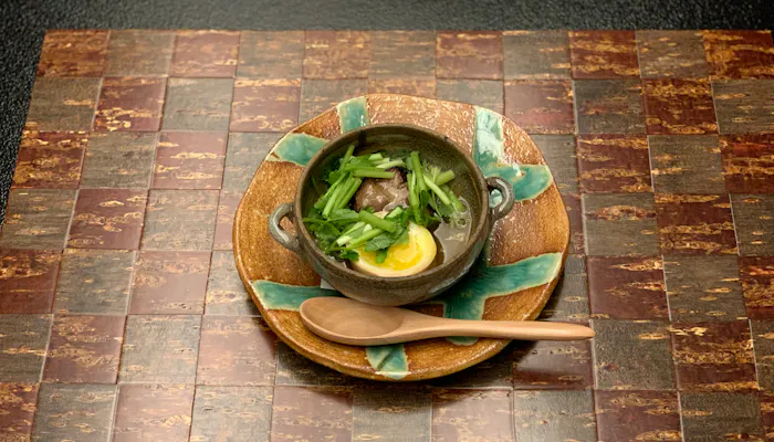夕食は、個室のお食事処で。温かいものは温かく、冷たいものは冷たく、仲居さんが絶妙なタイミングでお料理を提供してくれます。1月にお伺いしたので、ジビエ料理もいただけました。「伊豆猪の角煮」は、硬い猪肉はどこへやら、スプーンで切れてお肉にすっと歯が入るほど柔らかく凝縮された肉の旨味を感じます。卵は、わさび棚の水とお米を食べさせて育てた地元の鶏の卵が使われています。卵の味に角がなく、まろやかな味わいでした。