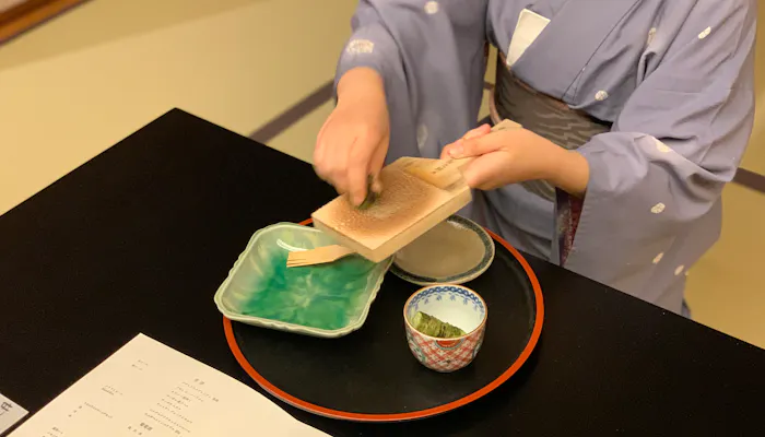 お造りでは、仲居さんが目の前で天城の天然わさびをすってくれます。最初は茎に近い甘い部分から先の方へ。フレッシュで後に引かない辛さに、そのままでもいただけるほど。