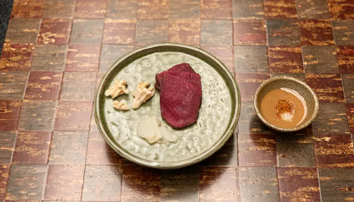 「伊豆鹿のロースと胡桃」。歯ざわり、舌触りが素晴らしい。鹿の臭み、硬さが一切ありません。ジビエの野性味が溢れすぎた味が好きな方には残念でしょうが、これが鹿本来の味なのではと思うほど、料理長の匠の技術が透かして見えます。