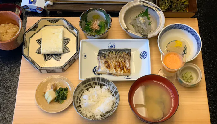 朝食はご飯の上に鰹節とわさびを乗せ醤油を垂らした、“わさびご飯”がおすすめです。