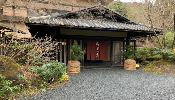 伊豆最古と言われる修善寺の温泉街から、少し離れたところに佇む「柳生の庄」。修善寺は雪が積もることはほとんどなく、比較的穏やかな気候なのだそう。お伺いしたのは1月中旬。冬の透き通った空気の中、竹林の小道を抜けると、本格数寄屋のお宿が見えてきます。
