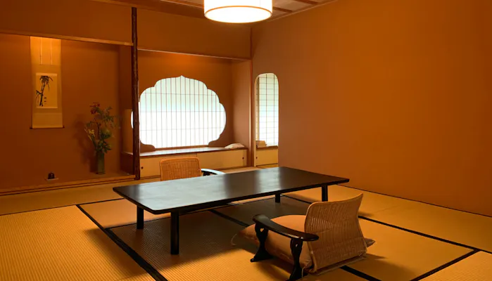 お宿3階にある「半露天風呂付 本数寄の部屋」の「初雁の間」「上弦の間」は、窓の形にも職人の技が光ります。「上弦の間」は、京都・銀閣寺の2階の窓のように、花頭窓になっています。「初雁の間」は櫛形窓。ただ壁に開けたというものではなく、ともに黒磨き面仕上げにしているというこだわり。障子を開ければ清々しい竹林が望め、風に揺れる笹の音が心を穏やかにしてくれます。