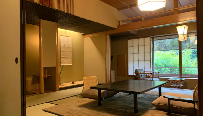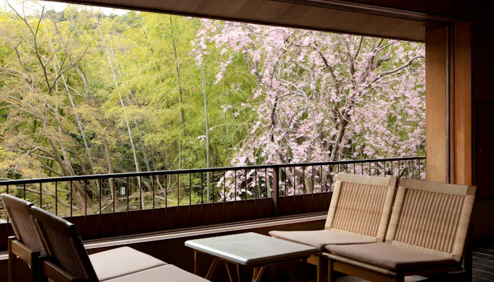 窓からは秋には紅葉、春には枝垂れ桜の絶景が楽しめるそう。毎年その景色を見るためにお泊まりになる方もいるそうです。