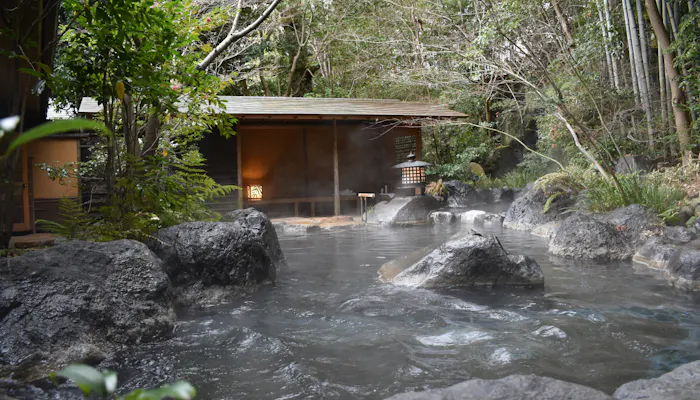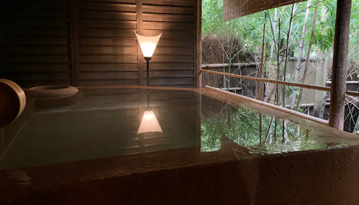 竹林に囲まれた岩風呂の露天風呂「武蔵の湯」。1200年以上も昔、弘法大師が湧出させたという伝説をもつ修善寺温泉が堪能できます。“美肌の湯”とも呼ばれるメタケイ酸を多く含む弱アルカリ性の湯。東屋でひと休みしながら、自分のタイミングで湯浴みを満喫しましょう。