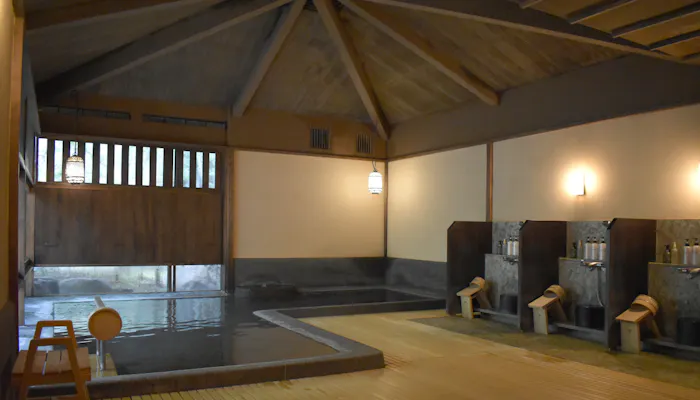 大風呂は2種類あり、「武蔵の湯」の露天風呂・内風呂と「つうの湯」の露天風呂・内風呂。「柳生の庄」という宿名も剣道が由来するように、大風呂の名前も剣豪の名前とその奥様の名前から付けられているそうです。天井が高くとても開放感ある内風呂。内風呂の浴槽も掻き落としと研ぎ出しが施されています。よく見ると、この壁も上と下で配色が異なり、廊下と同様に洗い出しと研ぎ出しが。