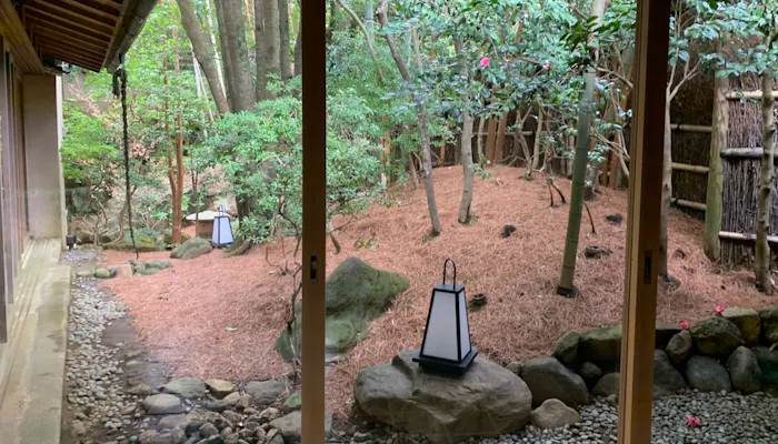 廊下やお部屋から見えるお庭のこだわりにも、ぜひ注目してみてはいかがでしょう。例えば、冬の時期だけ庭に施す敷き松葉。夜になれば行灯が灯り、より風情を感じさせてくれるでしょう。