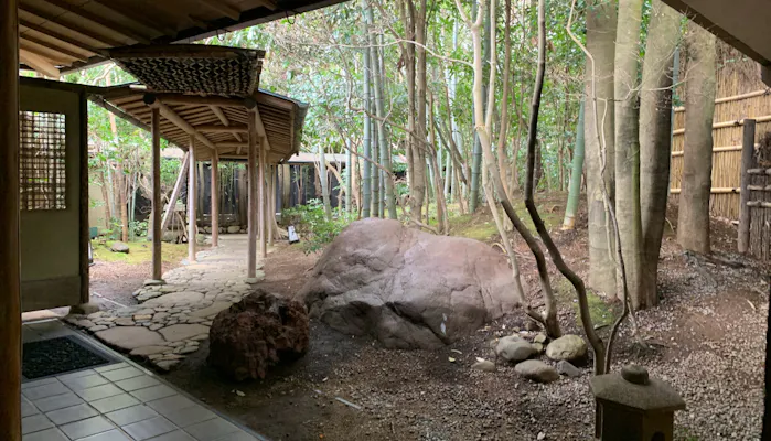 お部屋に付くのは「柳緑庵」という名の露天風呂。浴槽は風情ある東屋の中に設えられ、砂や土を振り固めて掻き落とし・研ぎ出し仕上げ。茶事の炉を本歌取り(情緒も含めて模した)した左官職人のこだわりの技。深みのある色合いと表面の光沢が美しく、湯浴みの心地よさは想像以上なのでしょう。