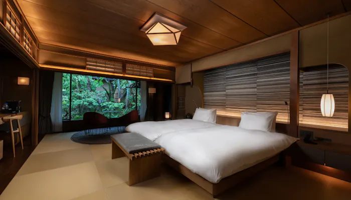 全5室の客室は、和を基調とした温かみのあるモダンな世界観と機能的なデザインが特徴。先進的でありながらも、京都の歴史や風情と絶妙にマッチしています。また、窓の向こうに見える日本庭園との一体感は、訪れる人に和の寛ぎと四季の移ろいを感じさせます。