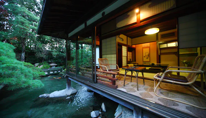 「奥の院ほてるとく川」は、世界遺産「日光東照宮」のすぐそばにあり、水を側に感じる宿 。水や季心などをテーマにした客室が備わり、湯心をテーマにした「吟龍」は、日本庭園に面したテラスに露天風呂がある客室です。