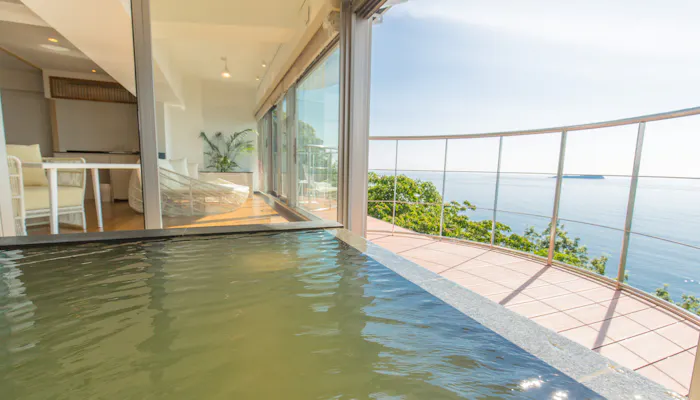 「ホテルふたり木もれ陽」は、伊東の高台に佇む天空の絶景宿。全10室スイート仕様の客室は、もちろんオーシャンビュー。源泉掛け流しの展望風呂で一面に広がる海と空の景色を眺めながら、至福の湯浴みを楽しめます。