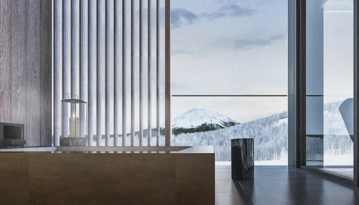 全室65平米以上の客室は、アート作品やこだわりの調度品を配したラグジュアリーな空間。窓の外にはニセコの絶景が広がり、リゾートライフを演出します。9室限定のスイートルームには、羊蹄山を眺める天然温泉の半露天風呂も備わります。