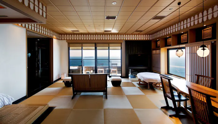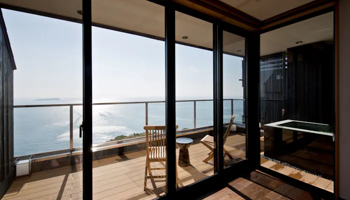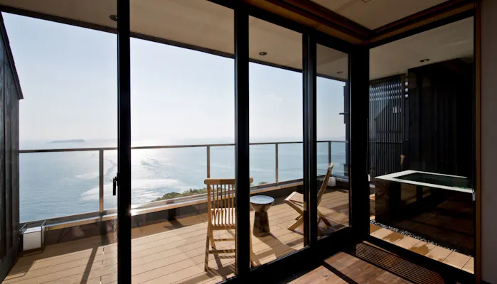 食事をはじめ、全室オーシャンビュー&源泉掛け流し露天風呂付というお部屋の設えも魅力的。中でも「ナチュラルスイート」は、室内と同等の広さを誇るオープンテラスに露天風呂を備えた客室。潮風を感じながら、海に漂うかのような湯浴みを楽しみましょう。