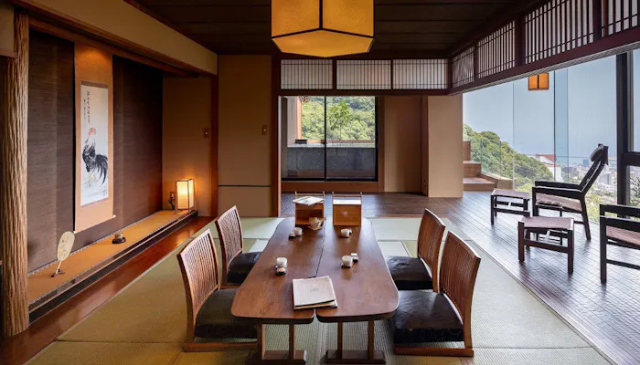 老舗料亭旅館「あたみ石亭」の別邸として誕生した「あたみ石亭別邸 桜岡茶寮」。6つのお部屋は日本庭園と能舞台を囲むように造られた数寄屋造りの離れ。全10室のうち6室に趣の異なる専用の露天風呂が備わっています。