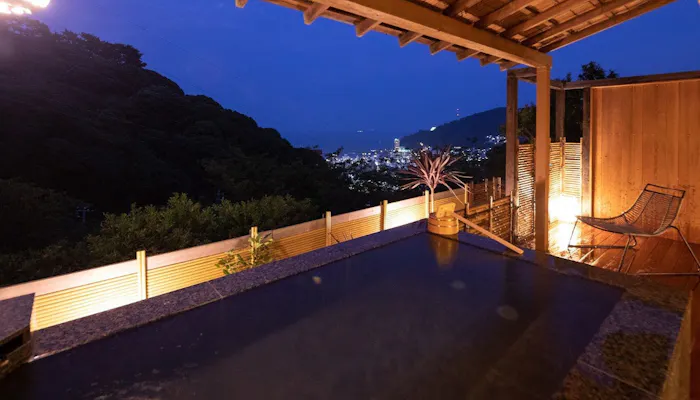 標高160m超の急勾配に位置する「熱海 さんが」。“究極に充実した”という意味を込めて名付けられた大人限定の宿には、7つのお部屋が用意されています。全室に備わる露天風呂から、相模湾を一望できます。