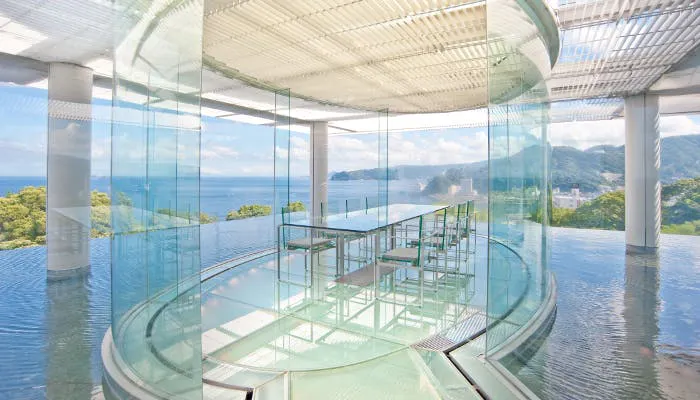 “水”と“ガラス”をテーマにした全4部屋のデザイナーズホテル「ATAMI 海峯楼」。世界的な建築家・隈研吾氏がデザインを手がけた宿としても有名です。隈研吾氏の手による非日常空間を、東京から1時間もかからない景勝地で堪能できるのは魅力的。