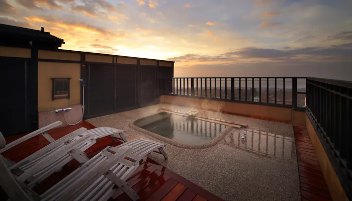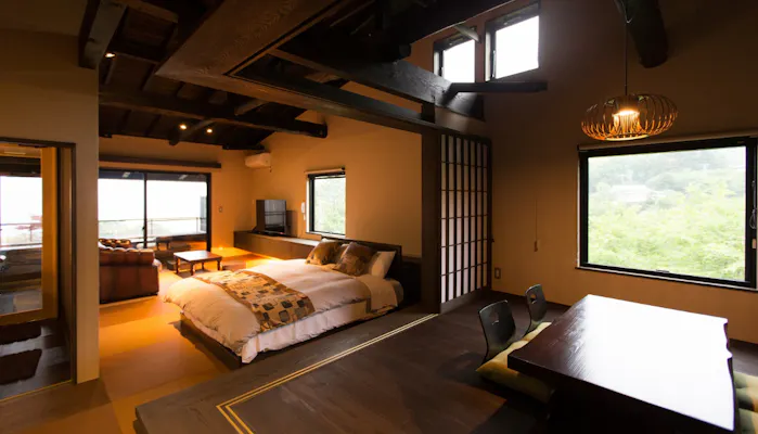 大室山の麓に佇む「お宿うち山 伊豆高原 全室露天風呂付き隠れ宿」は、約1,000坪の広大な敷地を贅沢に使用した全6室の離れの宿。お部屋はメゾネット式の古風な木造りになっており、非日常を体験できる居心地の良い空間に。2階に備わる露天風呂では、伊豆高原の絶景パノラマを独り占めできます。水平線に沈む夕陽を眺めながら、自然の雄大さを全身で感じてみませんか。