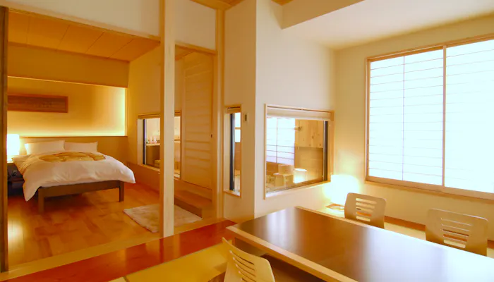 全6室が平屋造りの離れで構成されている大人の隠れ宿「はなれ宿 善積」。お部屋は数寄屋風、庵風、大正ロマン風など趣豊かな内装が特徴。すべてのお部屋に内風呂と温泉露天風呂を備えており、そのときの気分に合わせた湯浴みが可能です。お食事もお部屋でいただくため、チェックインからチェックアウトまで、気の赴くままに過ごせます。