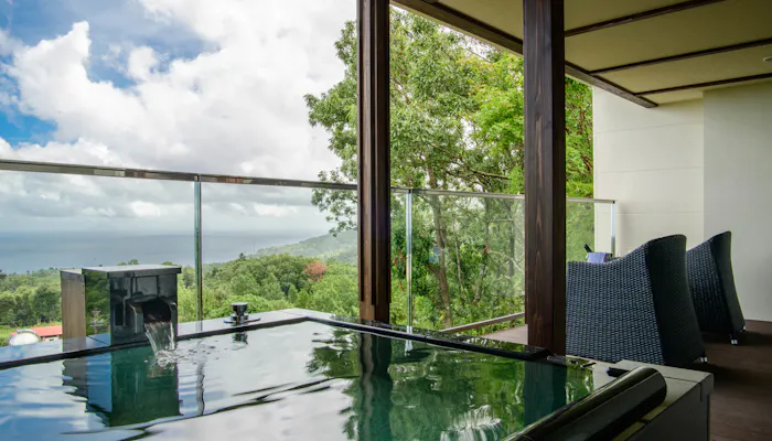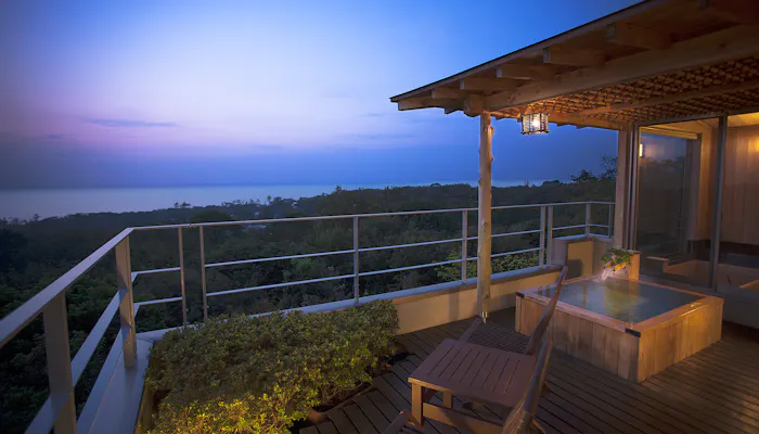 「全室源泉掛流し露天風呂付 大室の杜 玉翠」は、伊豆高原の高台に佇む全9室のモダンクラシックな宿。お部屋には、相模湾を望むテラスと源泉かけ流しの露天風呂を完備。また、目と舌で二度味わえる繊細かつ豪快な伊豆料理もこの宿のこだわりの一つ。ゆったり温泉と料理を堪能すれば、明日からのエネルギーも満たされることでしょう。