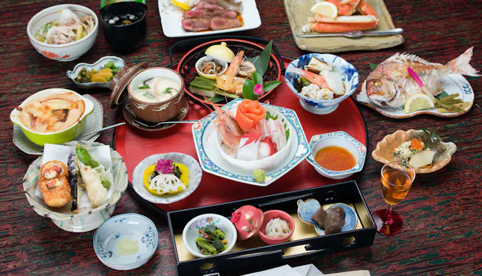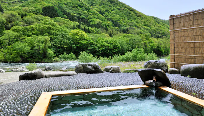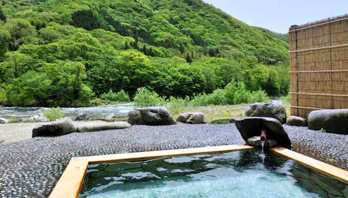 お食事は、旬の食材をたっぷり使ったお料理をどうぞ。日本料理をベースにジャンルに捉われない調理法で繰り出されるメニューの数々は、1皿ごとに驚きも提供してくれるでしょう。館内にある貸切風呂では、それぞれ地蔵または万代鉱源泉を楽しめるので、宿自慢の温泉に浸かって、思う存分癒されてみては。