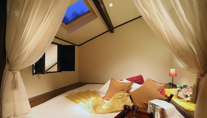 「スーペリアメゾネット」「ラグジュアリーメゾネット」の2部屋は、2階の寝室に天窓を設けたメゾネットタイプ。ベッドに寝転びながら、夕暮れのブルータイム、夜の星空や月光を独り占めできます。天窓付の貸切風呂では、照明を落とせば星空の中で湯浴みをしているような感覚になることでしょう。