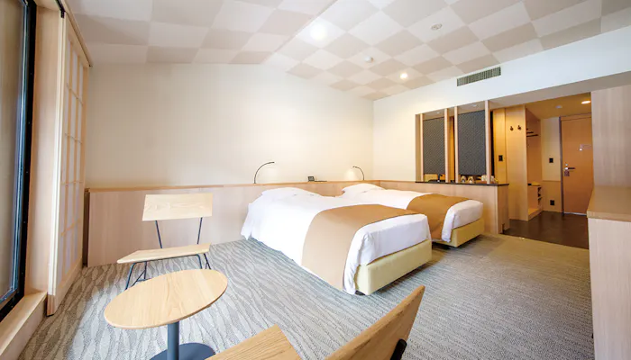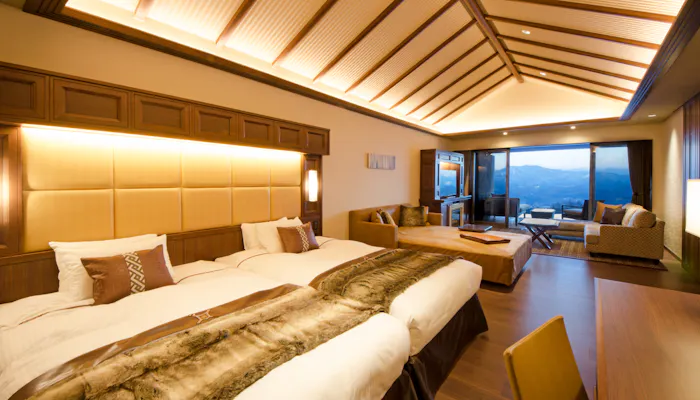 お部屋には趣向を凝らした家具が並び、和モダンな内装と相まって落ち着いた印象。全室に 温泉露天風呂が備わり、大自然を感じながら思う存分、泉質自慢の湯を満喫できます。宿の至る所から絶景を眺められるのは、自然との共存を大事にしているからこそ。