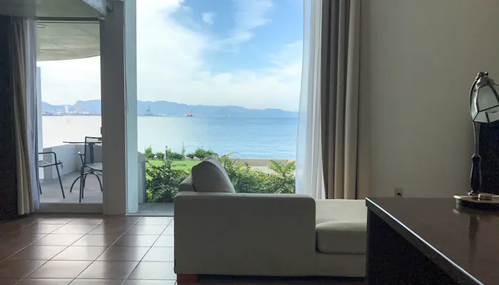瀬戸内海に面した客室もまた、フランスの田舎の家のような居心地の良い空間。天井まである大きな窓からは、海辺に立っているかのような臨場感のある景色を楽しめます。静かに打ち寄せる波の音をBGMに、シンプルで贅沢なひとときを。
