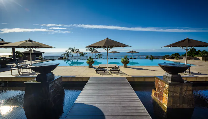 世界自然遺産の島・屋久島の亜熱帯雨林の高台に佇む「sankara hotel&spa 屋久島」。背後には雄大な山、目の前に海を望む絶好のロケーションで、自然の癒しと食の恵み、洗練されたサービスを堪能できるオーベルジュリゾートです。ロビーからの眺めは、まるでバリのリゾートを訪れたかのよう。