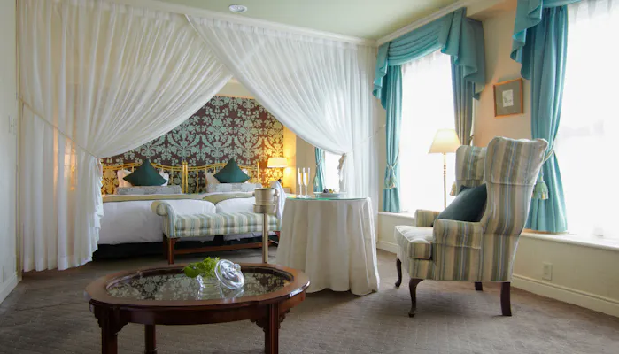 旧貴族の邸宅をイメージした館内は、一歩入ればまるで異人館に来たかのよう。全30室の客室は、味わい深い風合いの別誂え家具などクラシカルな意匠を凝らした空間です。英国貴族気分で優雅に寛ぎましょう。