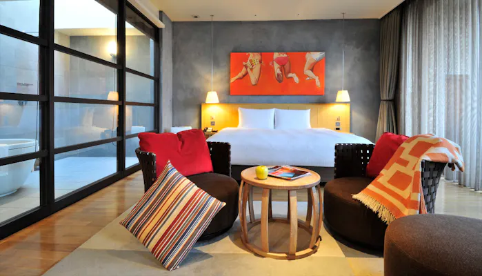 16室のみの客室は、スタイリッシュな空間にミッドセンチュリーの家具を配したテラス付のスイートルーム。全階クラブフロア仕様で、フリーのミニバーや宿泊者専用ラウンジ、屋上テラスのスパジャグジーなどがインクルーシブ。空間も過ごし方も、海外リゾートさながらの贅沢さです。