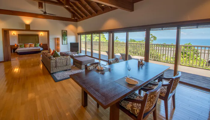 29室の客室は、アジアンテイストのインテリアが映えるラグジュアリー空間。どの客室も広々として開放感に溢れています。「ヴィラスイート オーシャンビュー」では、緑の向こうに澄んだ海を一望。ただ景色を眺め、何もしない優雅な時間を存分に味わって。