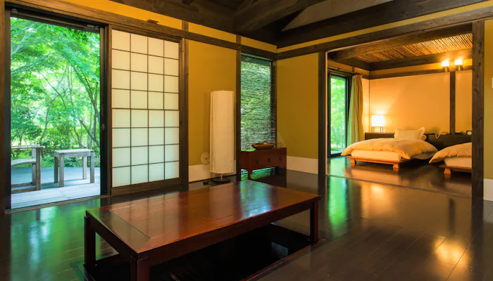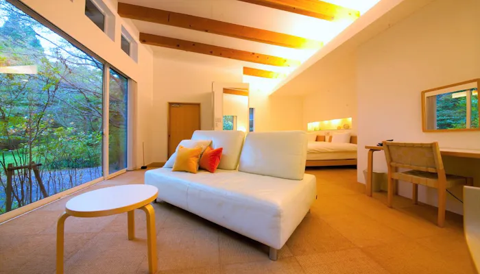奥湯布院の自然に囲まれた「奥宿 無相荘」。客室は離れ、別邸、スイートに大きく分かれ、全12室が趣の異なる贅沢な造り。それぞれ露天風呂または半露天風呂が付き、お部屋からは高原リゾートならではの景色を見渡すことができます。