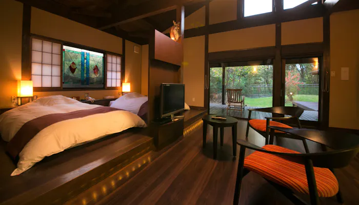 久住高原に約1万2千坪もの敷地を有する「フリューゲル久住」。全10棟のスイートルームの離れは、ステンドグラスやレトロなインテリアを配した和モダンな客室。全室に源泉掛け流しの露天風呂と内風呂が備わり、美肌効果のある炭酸水素塩泉が注がれています。