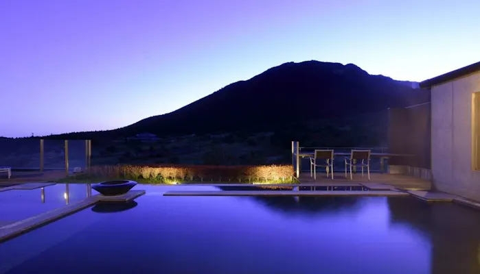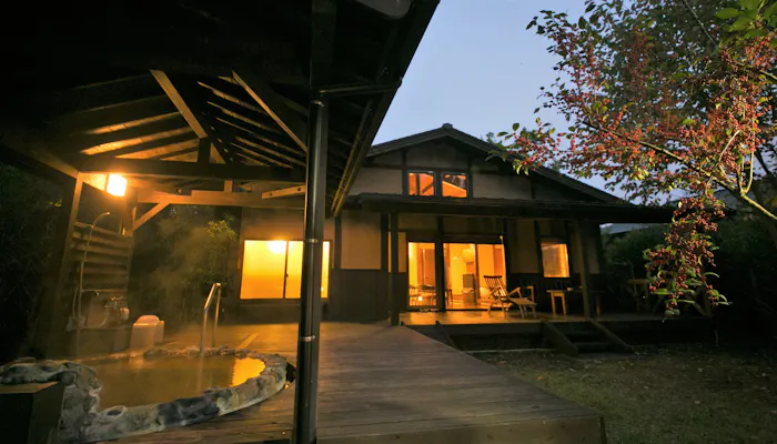 夜になるとより一層風情が漂います。輝く星空の下で、周りを気にすることなく好きなだけ美肌の湯を堪能しましょう。湯上がり後に、テラスに備わるデッキチェアに腰を掛け、涼みながら星空を眺めるのもいいですね。