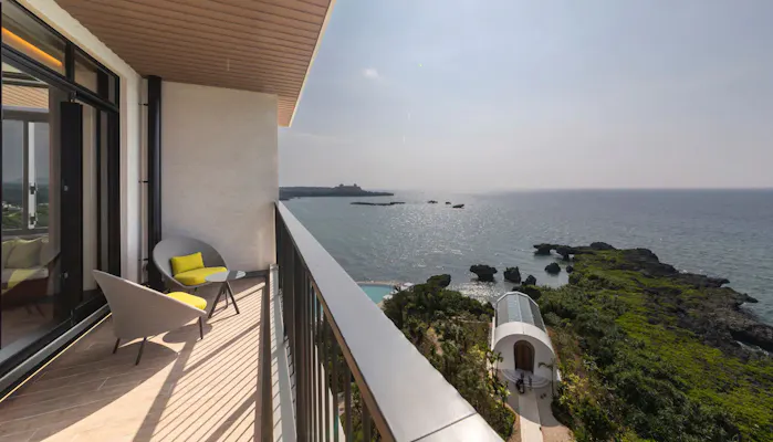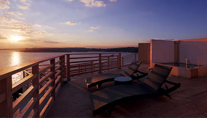 バルコニーや庭も含めると661平米もある大きな離れは、3面の窓から眺めるパノラマの景色が圧巻。屋上には専用の露天風呂があり、海と空の絶景に囲まれた開放感溢れる湯浴みを楽しめます。究極のプライベートな時間を心ゆくまで満喫しましょう。