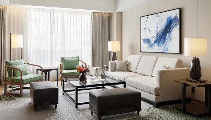 92平米の「エグゼクティブスイートキング」は、落ち着いた色調のリビングとベッドルームが備わります。優雅で洗練された美しさと自宅にいるような安らぎの空間は、上質な滞在を求める方にふさわしいでしょう。