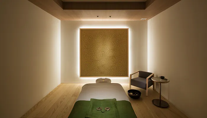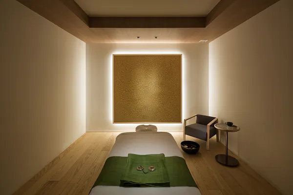 ・4つのトリートメントルームは「土」、「紙」、「布」、「木」をテーマに、日本の職人とコラボレーションしたアートが壁に飾られています。