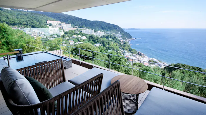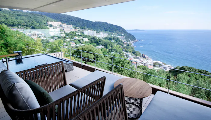 「ATAMI せかいえ」は、熱海伊豆山の高台から太平洋を見渡す全室露天風呂付きのリゾートホテル。視界を遮るもののないパノラマの景色が、非日常感とリゾート気分を高めてくれます。絶景自慢のこのホテルで指名したいお部屋が、最上階6階にある「オーシャンビューペントハウス TSUKI NO MICHI」。