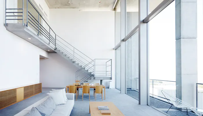メゾネットならではの開放感と、2フロアにわたる大きな窓から眺める瀬戸内海はまさに圧巻!下階のリビングルームからの眺めも素晴らしいのですが、ベッドルームのある上階からは更に奥行きのある景色を一望します。