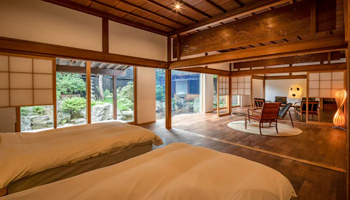 伝統的な建築と北欧家具が調和した特別室で露天風呂に寛ぐ