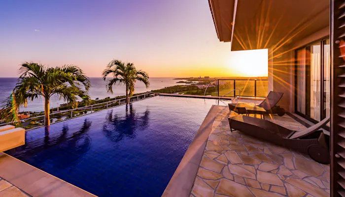 165平米のヴィラに温水プライベートプールと天然温泉を備え、お部屋やプールから絶景を独り占めする贅沢はこのお部屋ならでは。ヴィラから一歩も出たくなくなってしまうかも知れませんが、サンセットウイング5階にあるクラブラウンジも利用可能です。