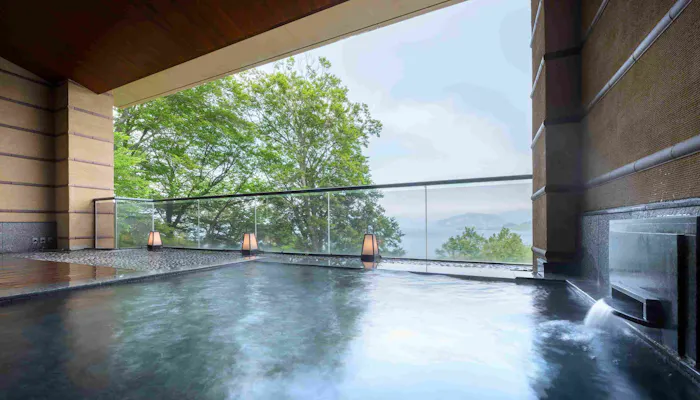 絶景が自慢の大浴場と展望露天風呂。十和田湖や遠くの山々を眺めることができます。適温に保たれた豊富な湯は、十和田の大自然が生み出した雪解け水をろ過したものを使用。ほのかに香る青森ヒバにも癒され、贅沢な湯浴みを楽しめます。