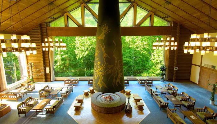 「奥入瀬渓流ホテル by 星野リゾート」は、奥入瀬渓流沿いに立つリゾートホテル。館内に入ると、巨大暖炉「森の神話」が圧倒的な存在感で出迎えてくれます。渓流や滝を望む露天風呂や、季節に合わせた豊富なアクティビティなど、奥入瀬の自然を満喫できる滞在が叶います。