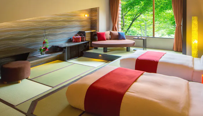 和洋さまざまなタイプがある客室。渓流に面した「渓流和室」は、自然美を最大限に楽しめるようシンプルなデザインに。ゆったり寛げる「渓流ごろんとチェア」や、優しい光が心地よい空間を演出する「木漏れ日ブラケット」など、こだわりの家具・設備を整えています。自然と対峙する和やかなひとときを過ごしましょう。