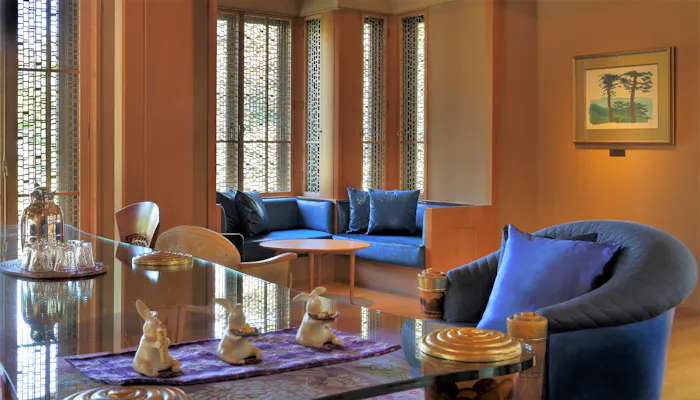 イタリア家具に囲まれた「さろん くら」は、夜になると自己申告制のバーに変わります。ほかにも約2,000冊の小説本を揃えた「松島文庫」や2階にある月見縁台、遊歩道、岬のテラスなどおすすめスポットがたくさん。思い思いの過ごし方で、自由自在に滞在を楽しんで。